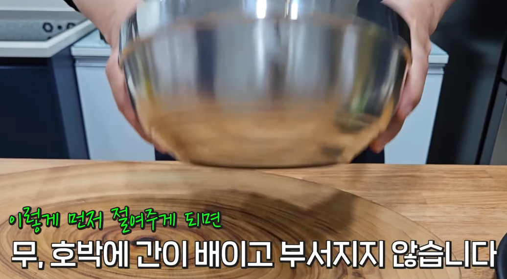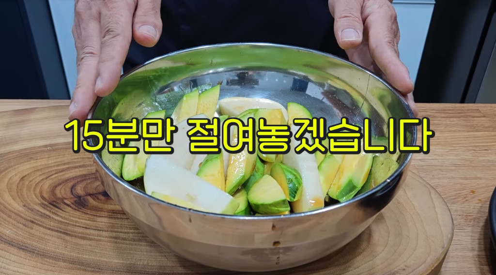 6. 아까 절여놓은 애호박과 무는 7분정도 지나면 위아래로 한번 뒤집어주세요. 이렇게 해야 더 잘 절여진다고 합니다.