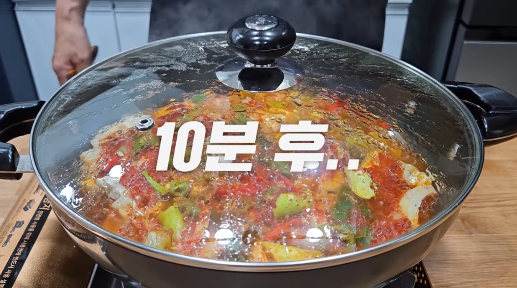 16. 냄비의 뚜껑을 닫고 약불로 은은하게 10분 졸여주세요.