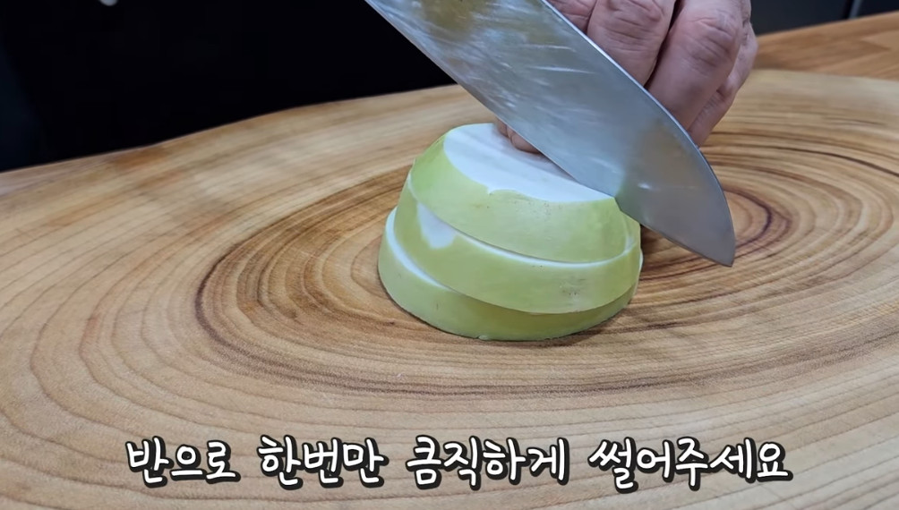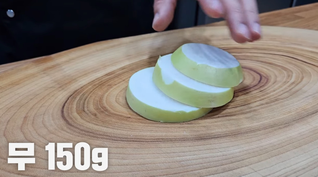 2. 무 150g을 세조각으로 썰고 반으로 한번만 큼직하게 썰어주세요.