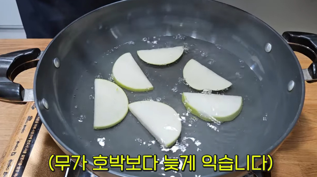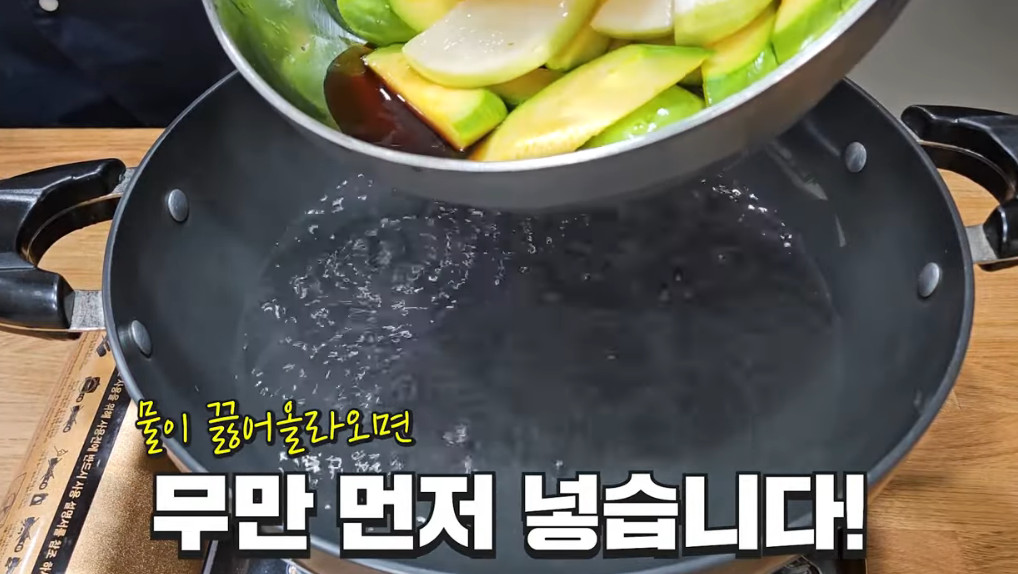 8. 물이 끓기 시작하면 무만 먼저 넣어주세요. 왜냐하면 무가 애호박보다 늦게 익기 때문이예요.