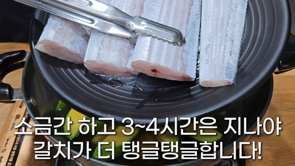 ※ 갈치는 비늘을 다 벗기고 깨끗이 씻겨서 소금간하여 3~4시간 절여놓아야 나중에 살이 더 탱글탱글하고 안부서진다고 해요.