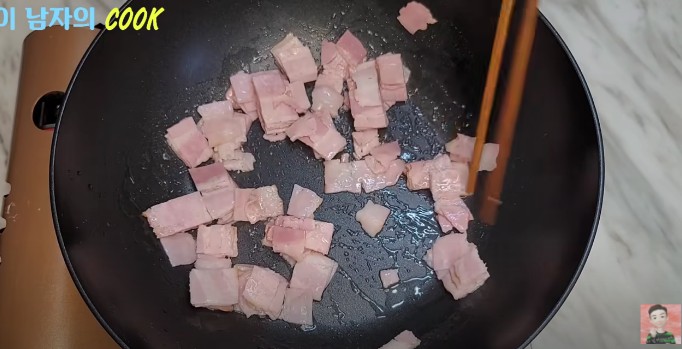 ● 팬에 식용유 한 큰술을 두르고, 제일 먼저 베이컨을 넣어 바삭하게 볶아주세요.
