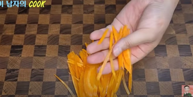 ● 당근은 반 개 정도를 채칼을 이용해 감자 굵기와 비슷하게 채 썰어주세요.