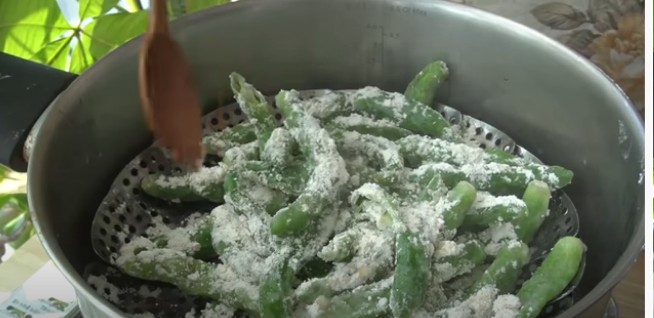 ▶찜기에 물이 끓기 시작하면, 밀가루옷을 입힌 꽈리고추를 넣고, 남은 밀가루는 위에 고르게 뿌려주세요. 밀가루가 충분히 덮여 있어야 나중에 찌고 나서도 밀가루 옷이 잘 남아있답니다.