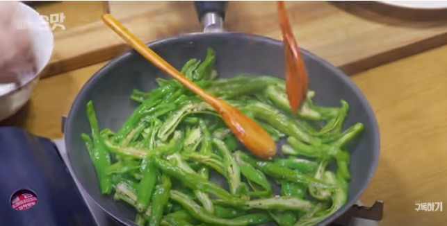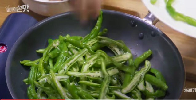 6. 팬에 식용유 2큰술을 두른 뒤, 꽈리고추를 먼저 넣고 볶아주세요.