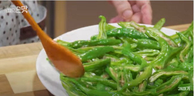 13. 그다음, 미리 식혀둔 꽈리고추를 넣고 들기름 1큰술을 더해 풍미를 더해주세요.