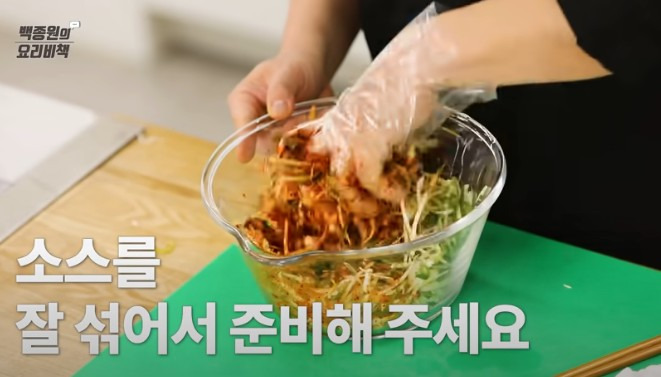 14. 파채에 비법소스 2와 파채무침 소스를 넣고, 잘 섞어둔 후 준비해 주세요.