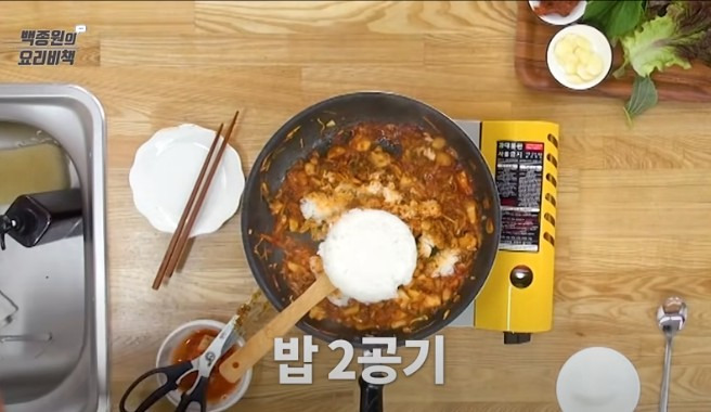 19. 두루치기를 다 먹고 나서, 볶음밥을 해 먹으면 정말 맛있어요. 김치를 적당량 썰어 넣고, 밥 2공기, 참기름, 김가루를 넣어 볶으면, 볶음밥이 완성됩니다!