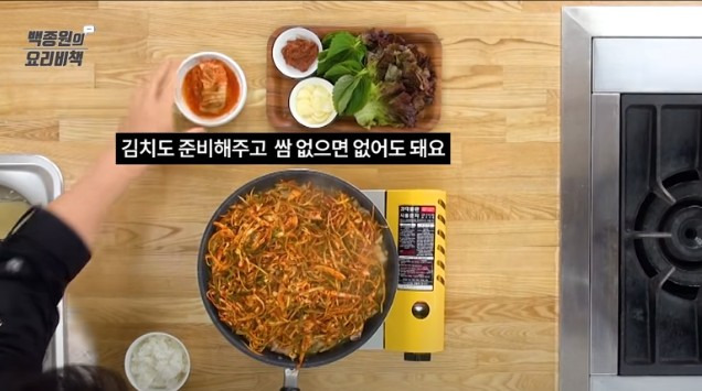 16. 그대로 끓고 있을 때, 살짝 휴대용 버너로 옮겨주세요. 익혀가며 먹기 좋습니다. 쌈과 김치도 함께 준비해 주세요.