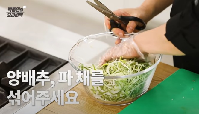 8. 파채가 너무 길면 먹기 좋게 자르세요. 그리고 양배추와 파채를 잘 섞어줘야 파채가 숨 죽지 않고 신선하게 유지돼요.