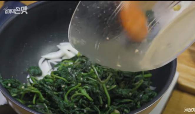 팬을 예열한 뒤 콩기름 1큰술을 넣어주세요. 콩기름을 넣으면 깻잎순이 부드럽게 변해요. 그 후 양파를 넣고 살짝 볶아주세요. 양파가 살짝 볶아지면 미리 양념해 둔 깻잎순을 넣고, 살짝 더 볶아주면 부드러움이 배가 됩니다. 그런 다음 물 50ml 정도를 팬 가장자리에 둘러 넣어주세요. 이렇게 하면 깻잎순이 더욱 부드럽게 익을 수 있어요.