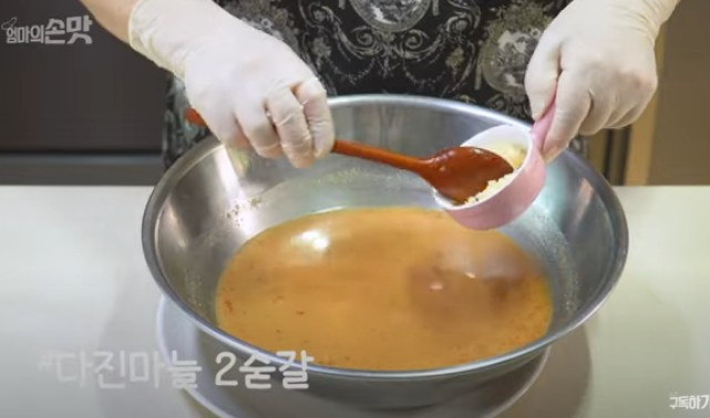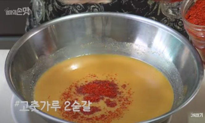 된장 물에 고춧가루 2숟갈을 듬뿍 넣고, 다진 마늘 2숟갈도 넣어주세요. 된장만 넣으면 맛이 밋밋할 수 있기 때문에, 까나리 액젓 50ml를 추가해주면 깊은 맛을 더할 수 있습니다. 멸치액젓을 대신 사용해도 괜찮아요.