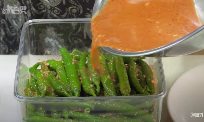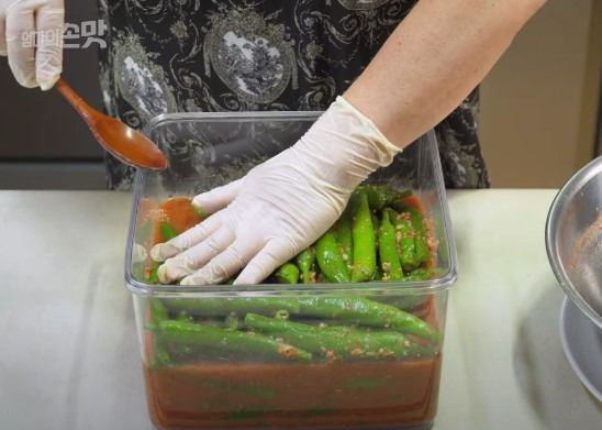 약 한 달에서 한 달 반 정도 보관한 후에 드시면 고추에 양념이 잘 배어 더욱 맛있습니다. 눌러 놓을 수 있는 눌러봉이 있다면 사용해 주세요.