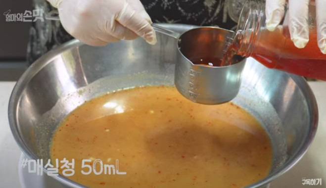 매실청 50ml를 넣어주세요. 만약 매실청이 없다면, 맛술을 대신 넣거나 다른 과일청을 사용해도 좋습니다.