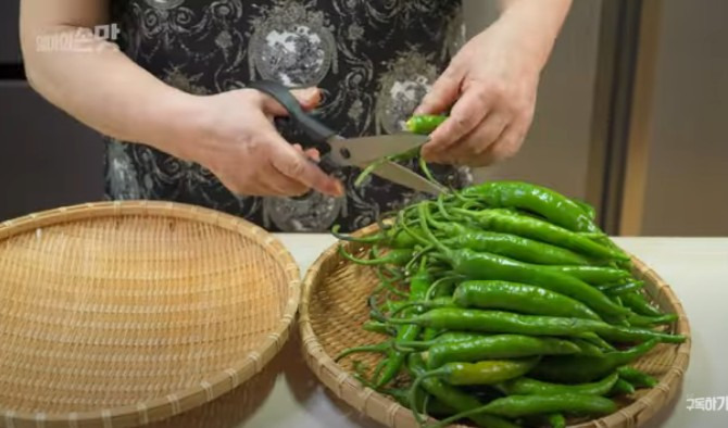 고추의 끝부분을 살짝 잘라주면 양념이 잘 스며들어요. 이렇게 끝을 잘라주면 이쑤시개로 구멍을 하나하나 뚫지 않아도 돼서 훨씬 편리하답니다. 정말 똑똑한 방법이죠? ^^ 이런 작은 팁이 도움이 되네요ㅎㅎ
