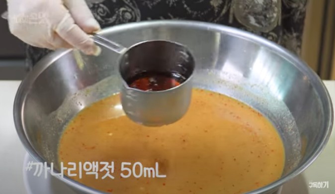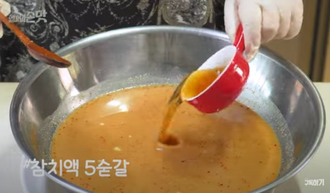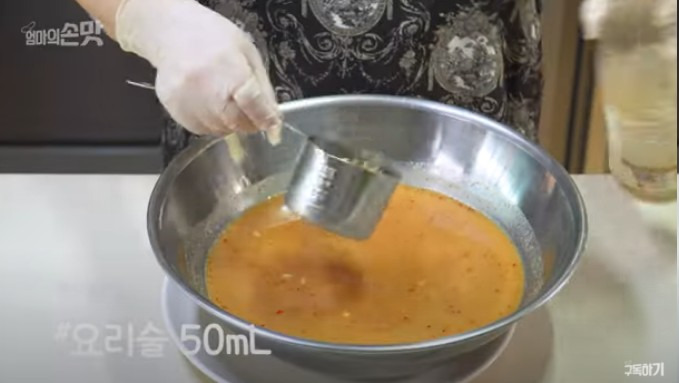 그다음, 요리술이나 맛술, 미림을 50ml 넣고, 참치액 5숟갈을 추가하여 감칠맛을 더해줍니다. 참치액이 없다면 까나리 액젓만 사용해도 괜찮습니다.
