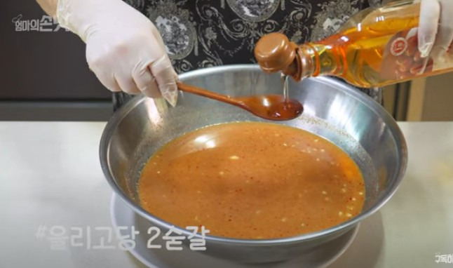 마지막으로 올리고당 2숟갈을 넣고 섞어주세요. 간이 약간 짭짤해야 오래 보관할 수 있으며, 너무 싱겁다면 고추가 물러질 수 있으니 주의하세요.