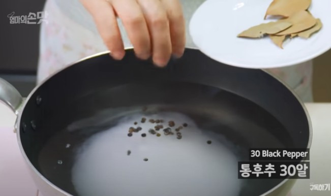 물 1리터를 냄비에 붓고 끓인 후, 꽃소금 3큰술과 설탕 200ml(1컵 미만)을 넣어주세요. 여기에 통후추 30알과 월계수잎 5~6장을 넣고 끓여주세요. 식초는 끓는 동안 향이 날아갈 수 있으니 끓인 후 마지막에 넣는 것이 좋아요.