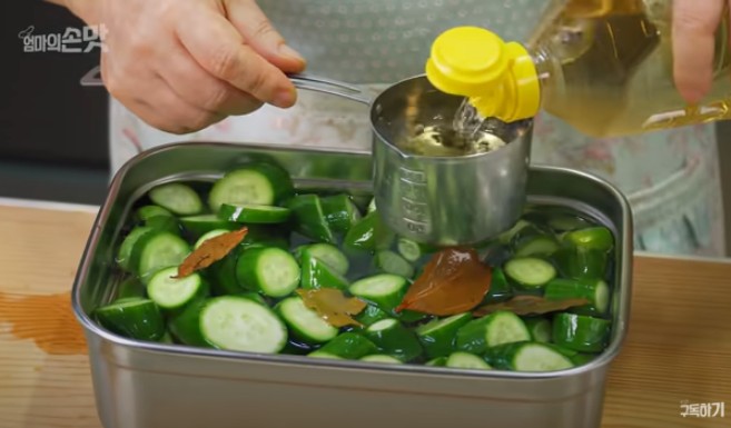 단촛물이 끓기 시작하면, 오이를 담아둔 그릇에 부어주세요. 그 후, 식초 200ml(1컵)을 추가합니다. 더 새콤한 맛을 원하면 식초를 50~100ml 정도 더 넣어도 좋아요. 간을 맞춰가며 취향에 맞게 조절하면 됩니다.