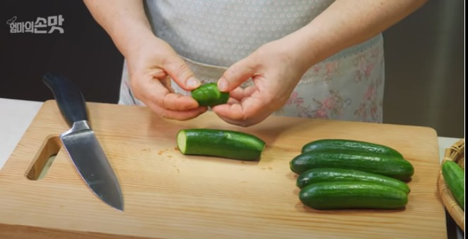 오이의 꼭지를 잘라낸 후, 원하는 크기로 썰어주세요. 그냥 썰어도 괜찮지만, 조금 더 멋을 내고 싶으면 칼집을 내서 써는 것도 좋아요.
