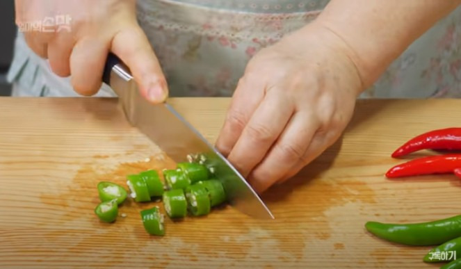 청양고추 5개와 홍고추 4개는 둥글게 썰어주세요. 고추씨는 잘 털어내고 사용하세요.