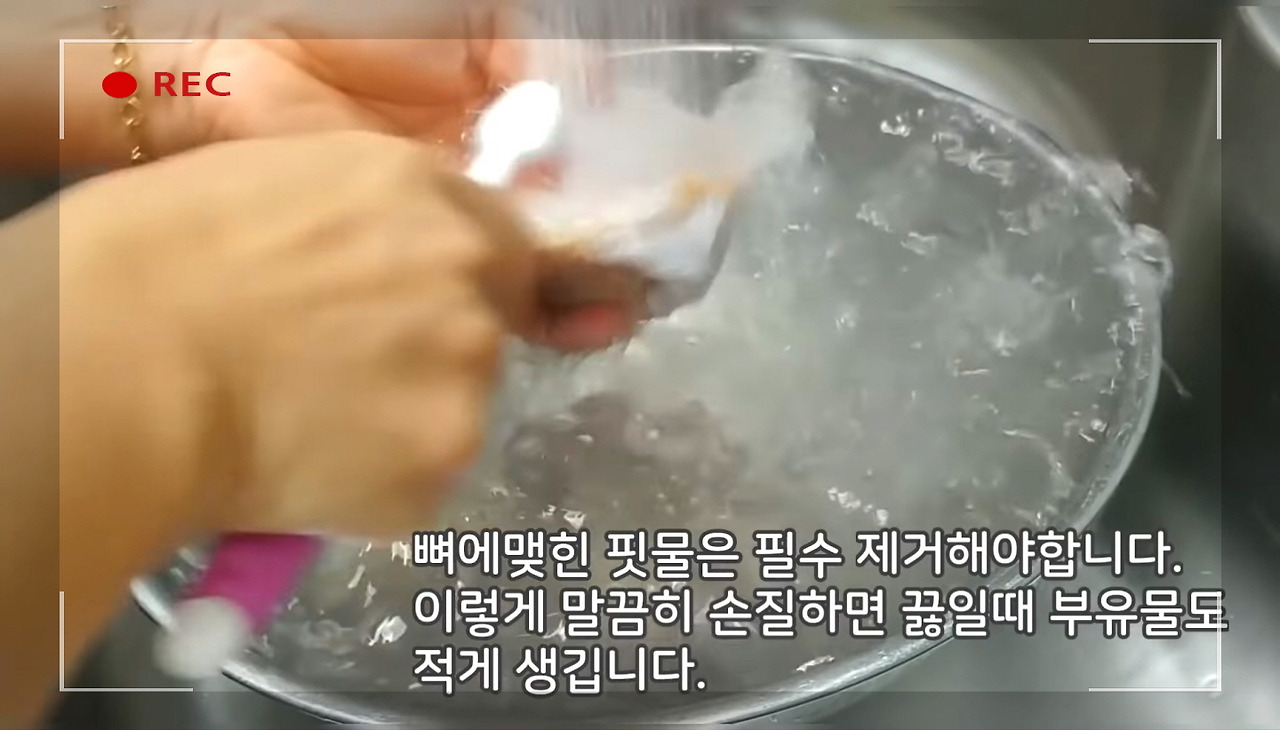동태 뼈에 남아 있는 핏물을 제거하는 것은 꼭 필요한 과정이에요. 이렇게 꼼꼼히 손질하면 국물에 부유물이 적게 생겨 더욱 깔끔하고 맛있는 동태탕을 완성할 수 있답니다.