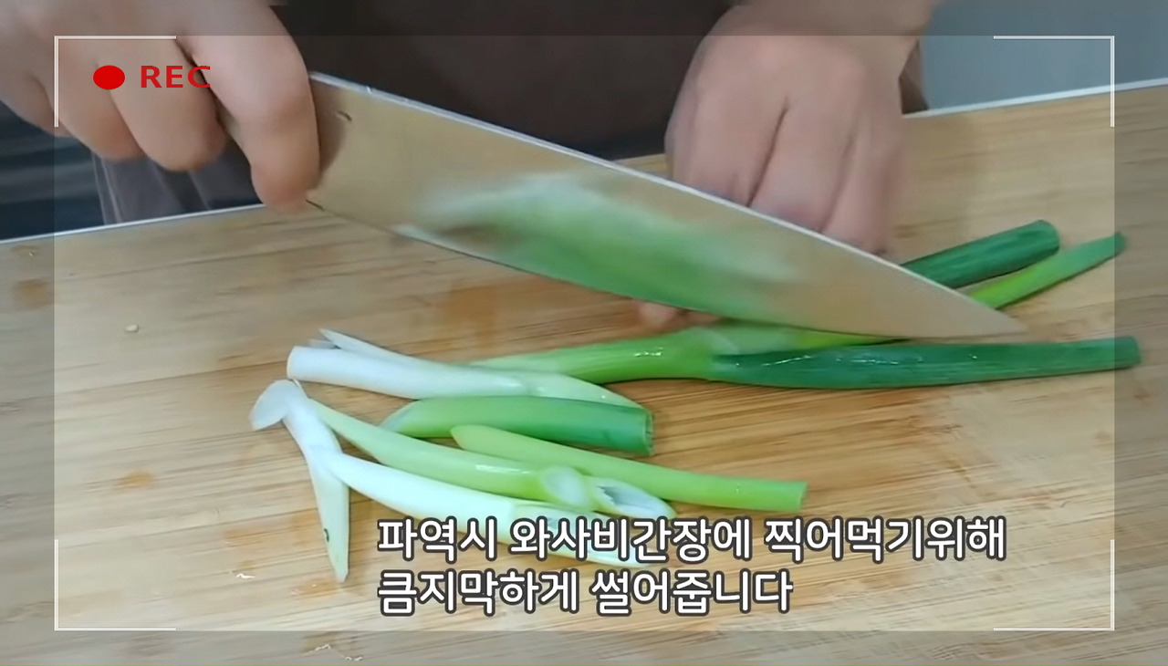 부추, 쑥갓, 대파를 와사비 간장에 찍어 먹으면 정말 별미예요.