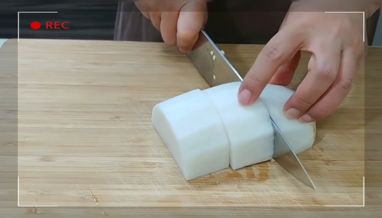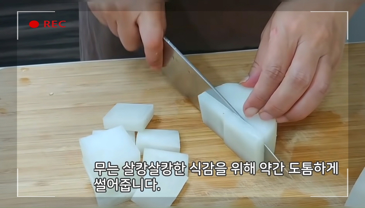 동태찌개에 넣을 무는 이렇게 두툼하게 나박썰기 하면 돼요. 이로써 동태찌개를 맛있게 끓이기 위한 재료 손질이 모두 완료됐어요.