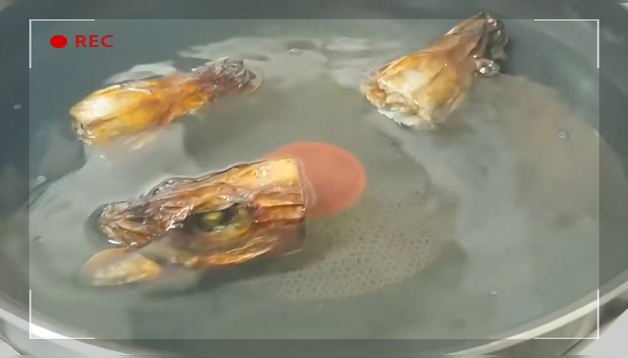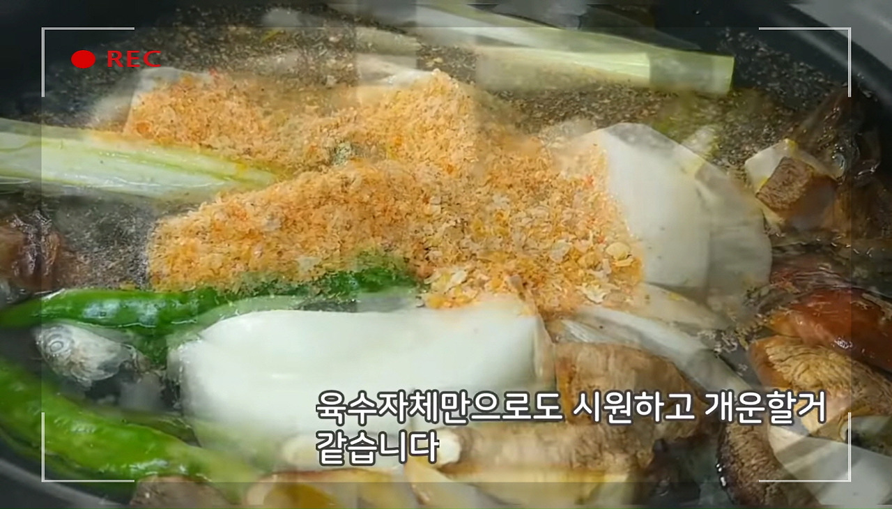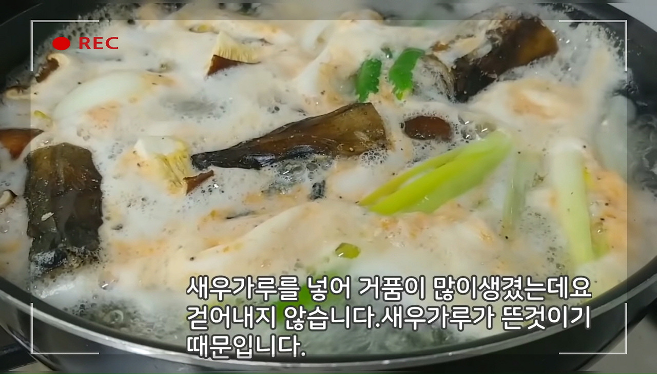 새우가루를 넣어 거품이 많이 생긴 것처럼 보일 수 있지만, 이는 부유물이 아니라 새우가루가 물 위에 떠 있는 것이므로 굳이 걷어내지 않아도 괜찮아요.