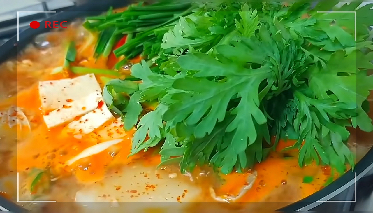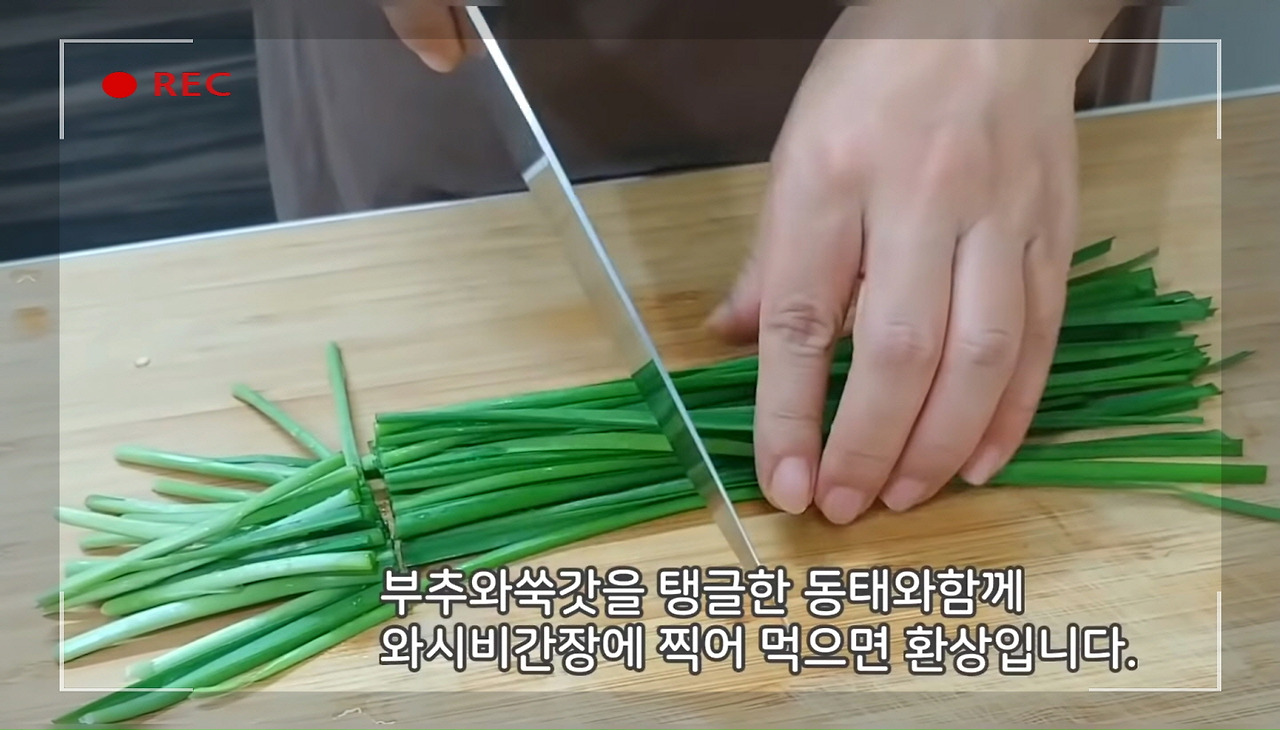 부추와 쑥갓의 상큼한 향이 동태찌개의 얼큰하고 시원한 냄새와 어우러져 주방 가득 퍼집니다.