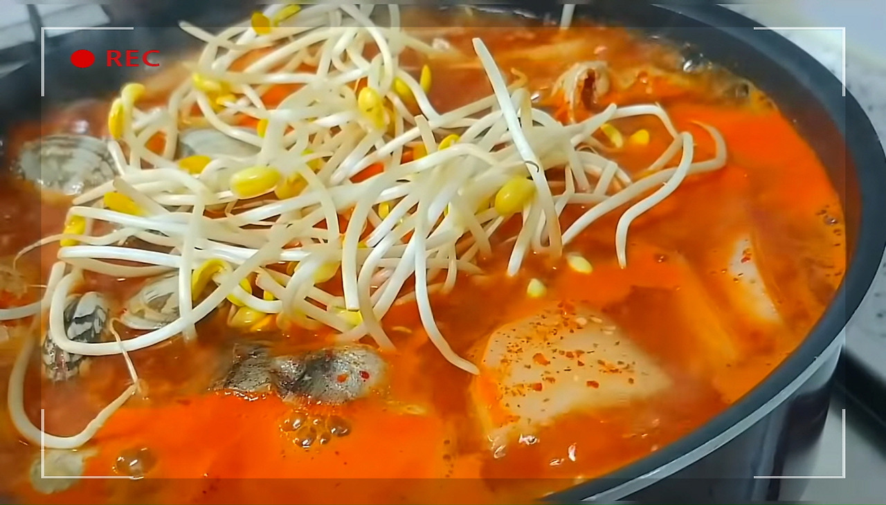 동태찌개가 다시 끓기 시작하면 거품을 걷어내고, 불을 중불로 줄인 후 바지락과 콩나물을 넣고 3분간 더 끓여 주세요.