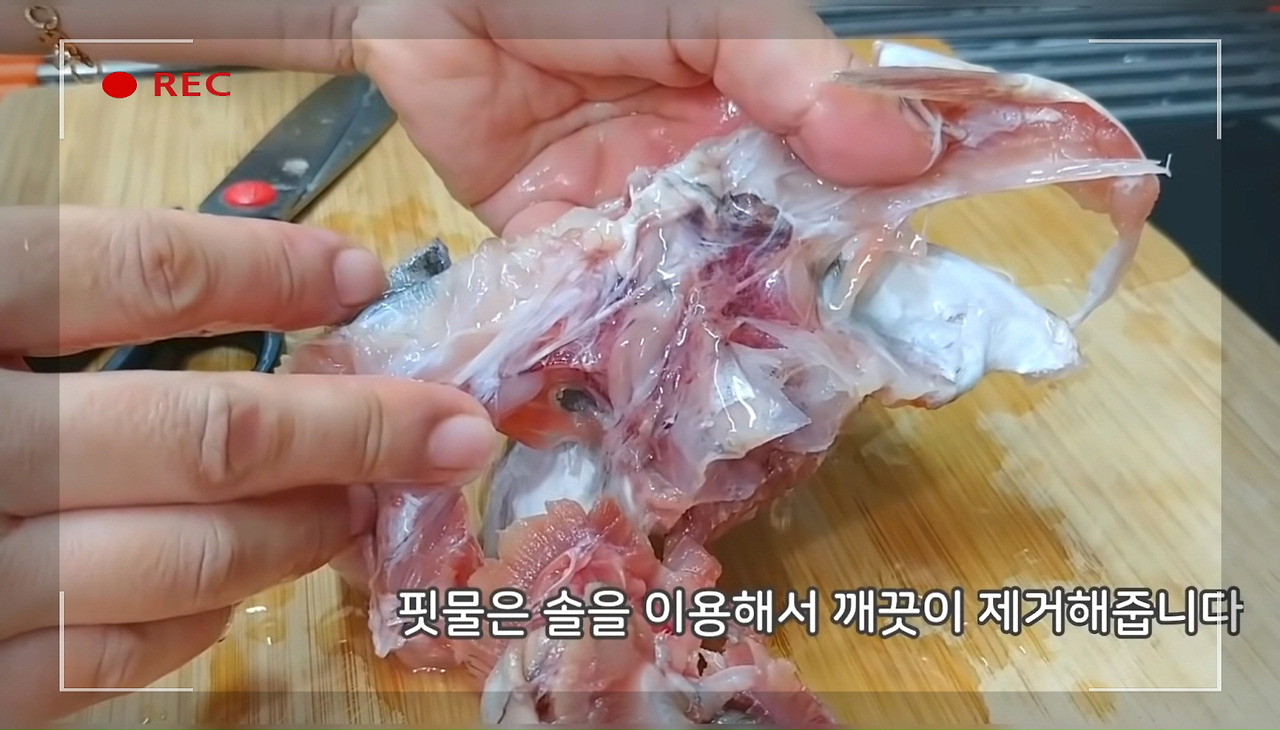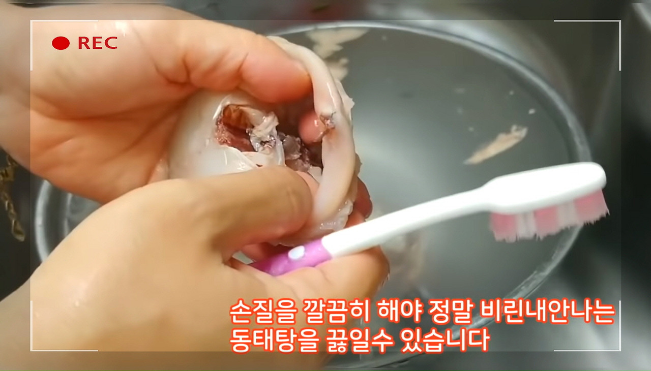 이제 동태의 비린내를 잡는 과정을 시작해볼게요. 먼저 동태 머리 부분의 아가미와 핏물을 제거하고, 솔을 이용해 구석구석 남아 있는 핏물을 꼼꼼히 닦아내 주세요.