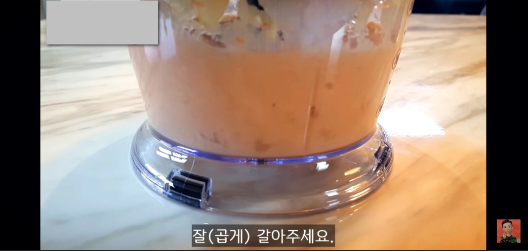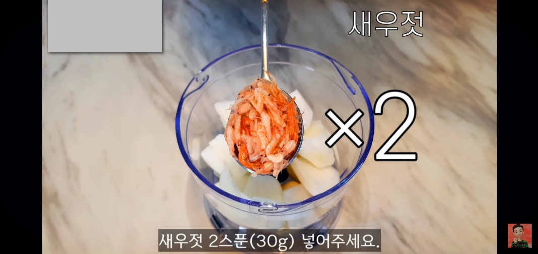 또한 새우젓 두 스푼을 넣어 감칠맛을 한층 높여주세요. 그럼 이대로 갈아주면 됩니다.