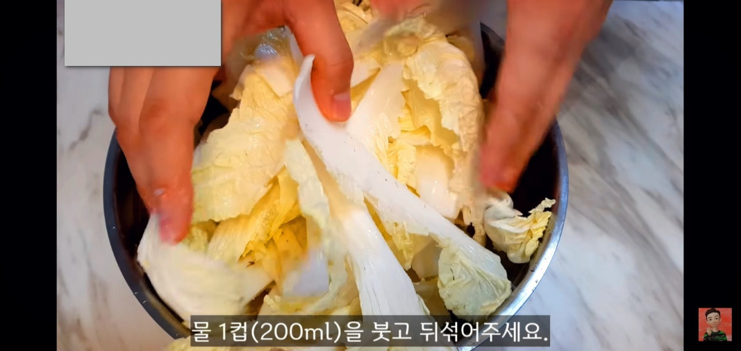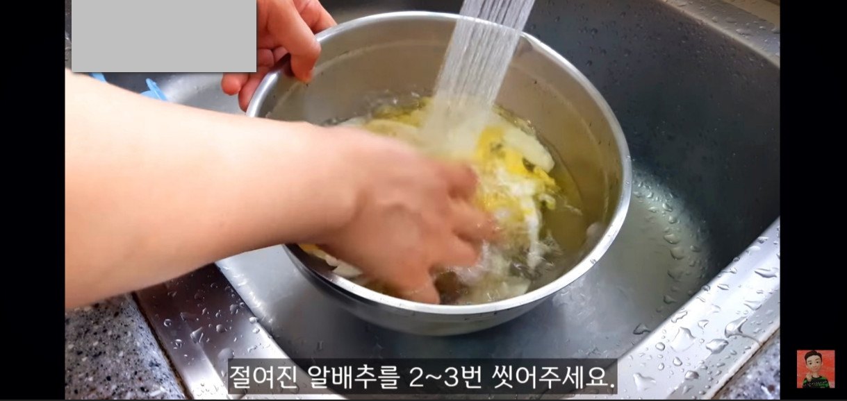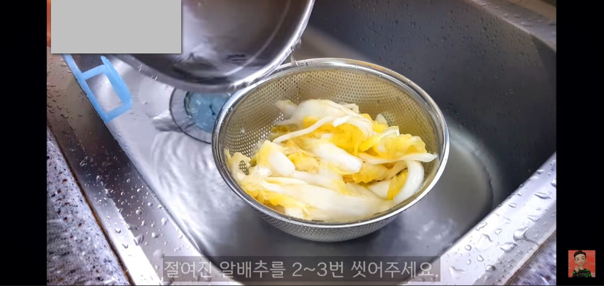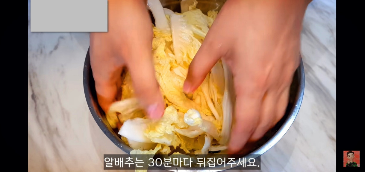 배추는 30분마다 뒤집어가며 잘 절여주고, 한 시간 반이 지나면 알배추를 흐르는 물에 2~3번 씻어주세요.