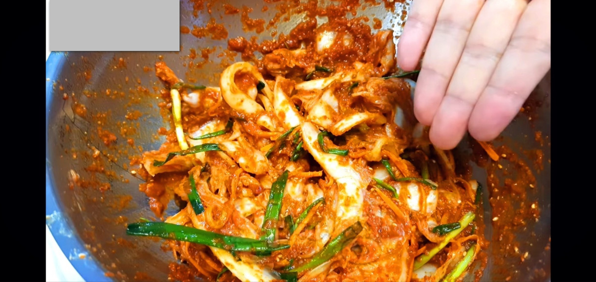 이렇게 잘 섞은 후, 한 시간 반 정도 배추가 부드러워지도록 절여주세요. 배추가 절여지는 동안, 배추겉절이를 만드는 다음 단계를 준비해볼게요.