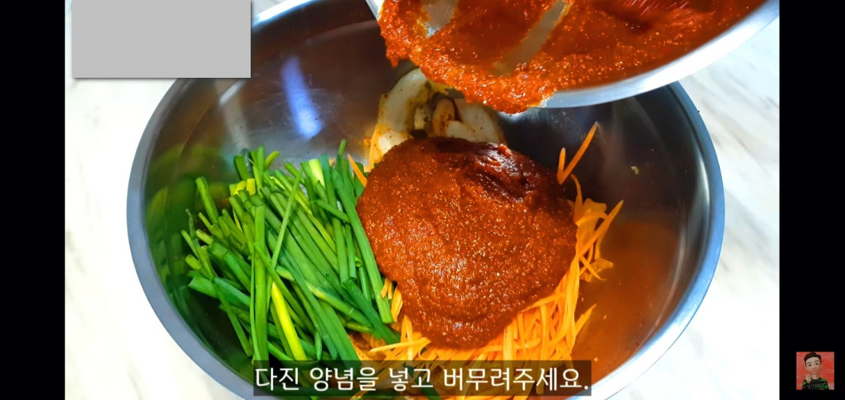 만들어둔 양념장과 통깨 2스푼을 넣고 잘 섞어주면 돼요.