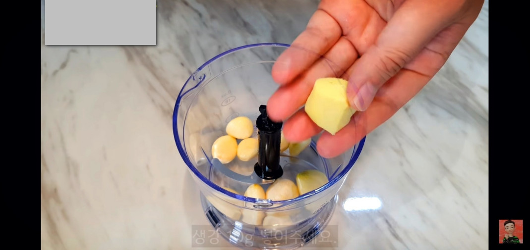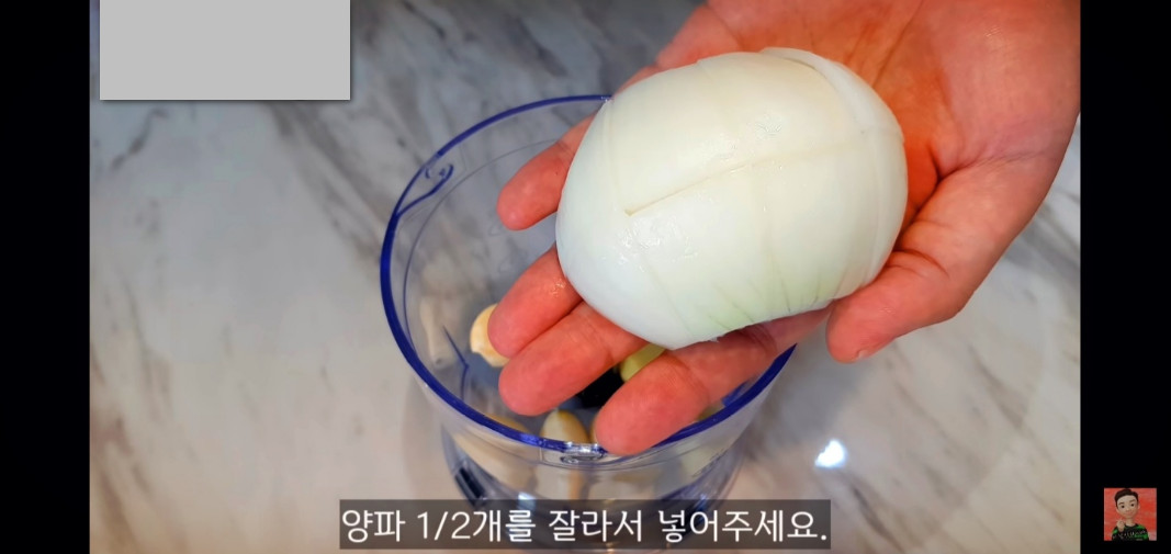 배추겉절이에 사용할 채수를 만들어볼게요. 믹서기에 마늘 10쪽, 생강 한 조각, 양파 반 개를 잘게 썰어 넣고, 달콤한 맛과 풍미를 더해주세요.