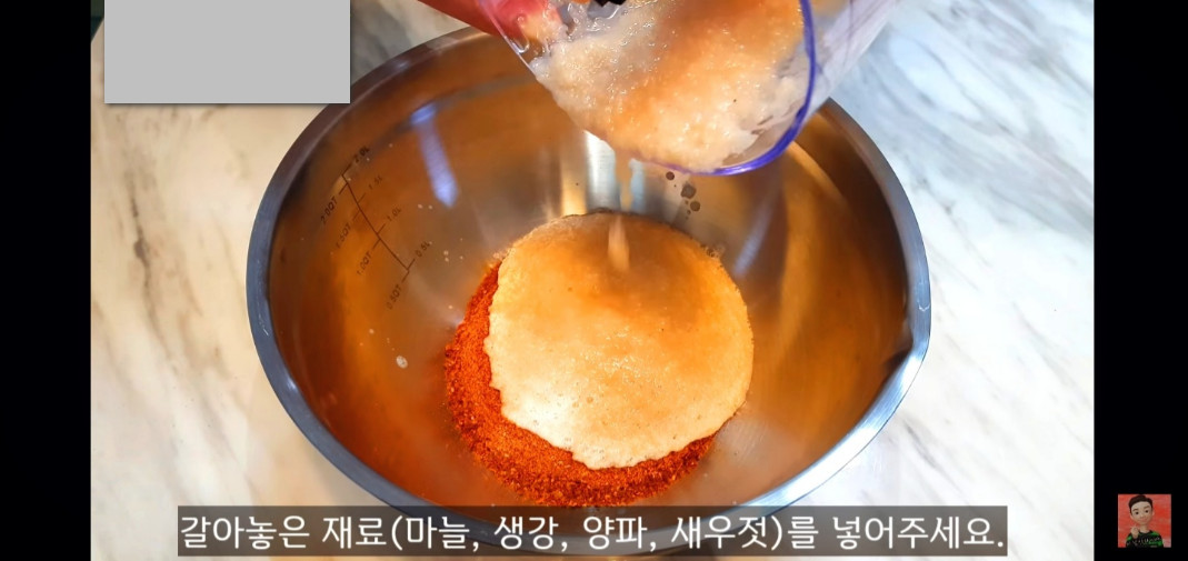 이제 배추겉절이 양념장을 만들 차례예요. 굵은 고추가루 6스푼과 갈아둔 채수를 넣어주세요.