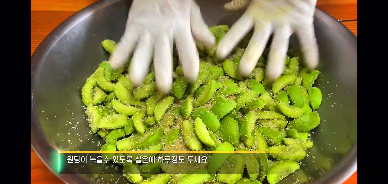 이제 본격적으로 매실장아찌를 담가보겠습니다. 잘라둔 매실에 원당(정제하지 않은 설탕) 700g을 넣고 잘 섞어준 후, 실온에 하루 동안 숙성시켜 매실이 잘 절여지도록 해주세요.