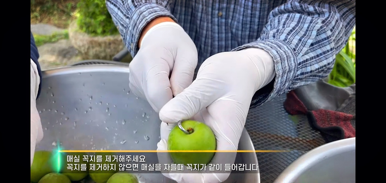매실을 깨끗한 물에 잘 씻어 이물질을 제거한 후, 이쑤시개나 포크, 과도를 사용해 매실의 꼭지를 살짝 파서 제거하면 더 깔끔하고 맛있는 매실장아찌를 만들 수 있어요.
