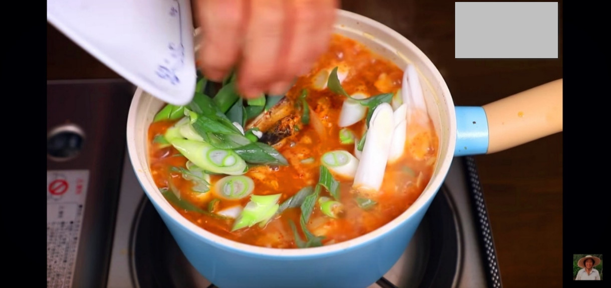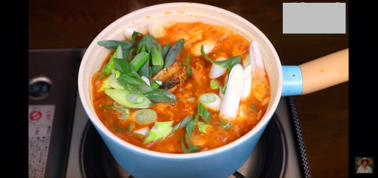 1분 더 끓인 후, 대파를 넣고 마지막으로 30초 정도 더 끓이면 오늘의 꽁치통조림 김치찌개가 완성됩니다!