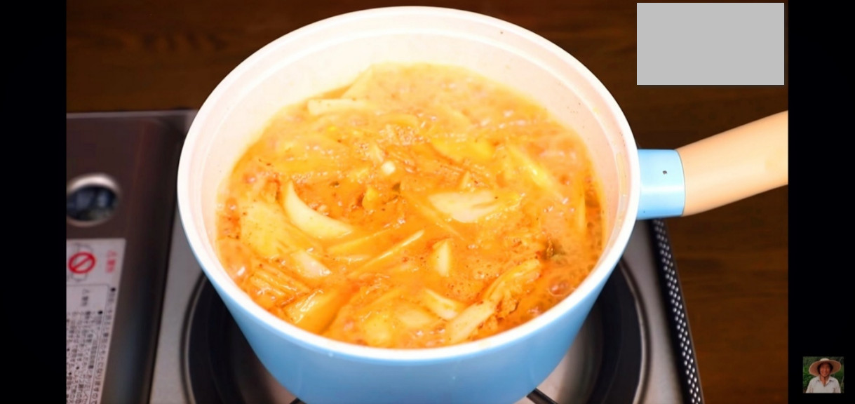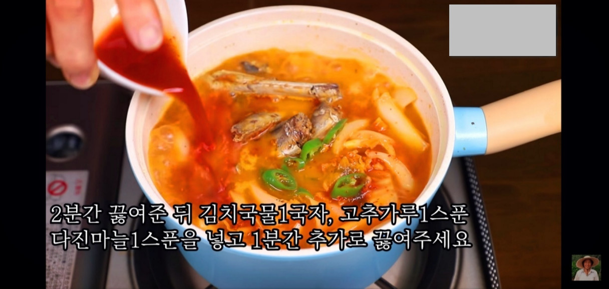 그다음, 김치국물 한 국자, 고추가루 한 스푼, 다진 마늘 한 스푼을 넣고 1분 정도 더 끓여주세요!