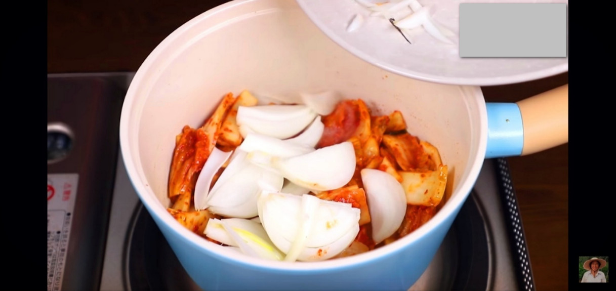 먼저 냄비에 들기름 한 스푼과 김치, 양파를 넣고 1분 정도 볶아주세요.