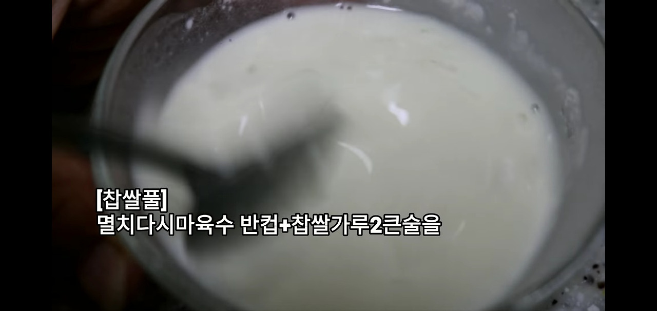 멸치다시마육수 반 컵에 찹쌀가루 두 스푼을 넣고 잘 풀어서 찹쌀풀을 만들어줘요. 그 다음, 멸치다시마육수 150ml를 끓이면서 준비해둔 찹쌀풀을 조금씩 넣고 풀어가며 끓여주면, 총각김치에 사용할 찹쌀풀이 완성됩니다.