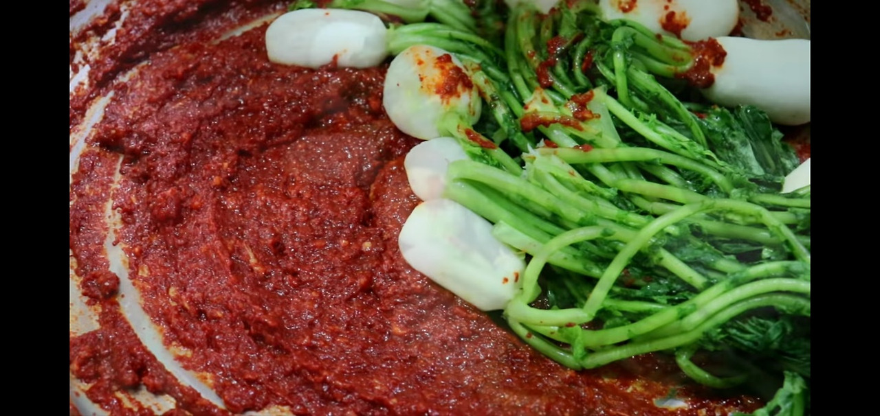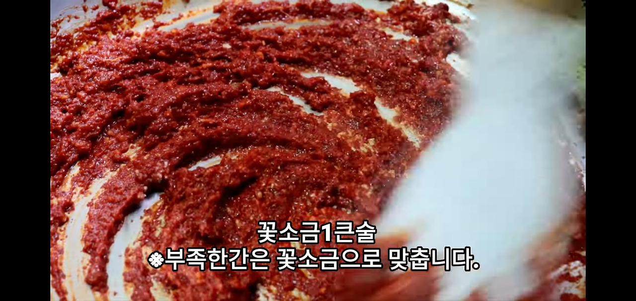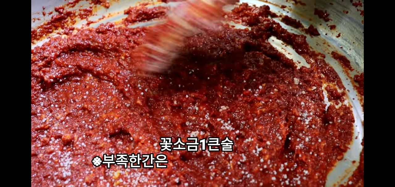 이제 잘 섞어준 후 간을 보고, 꽃소금을 추가해서 총각김치의 간을 맞추면 양념장이 완성돼요.