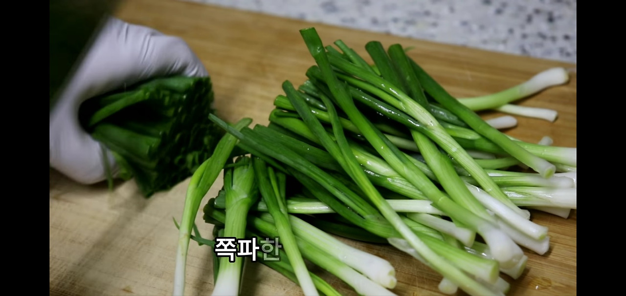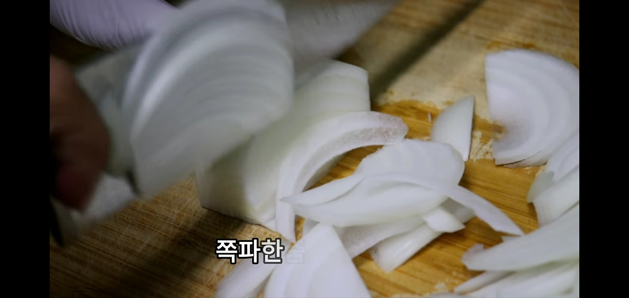 총각김치에 들어갈 재료 손질은 정말 간단해요. 쪽파 한 줌은 반으로 갈라 길게 자르고, 양파 한 개는 얇게 슬라이스해서 준비하면 재료 손질이 끝난답니다.