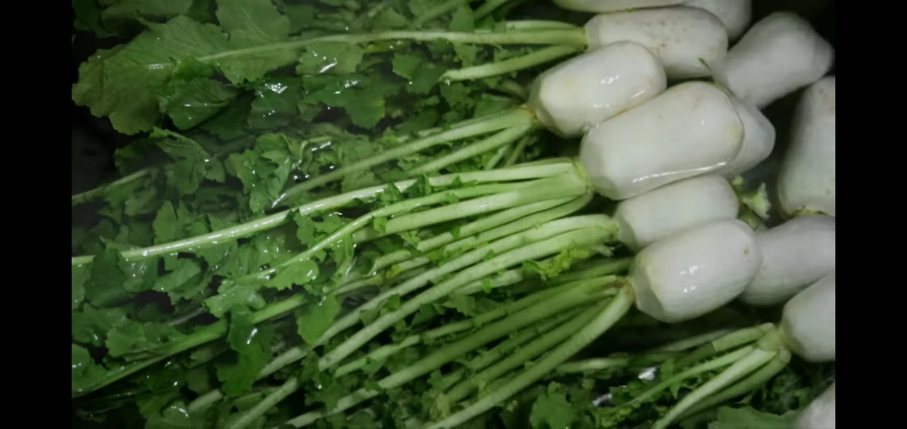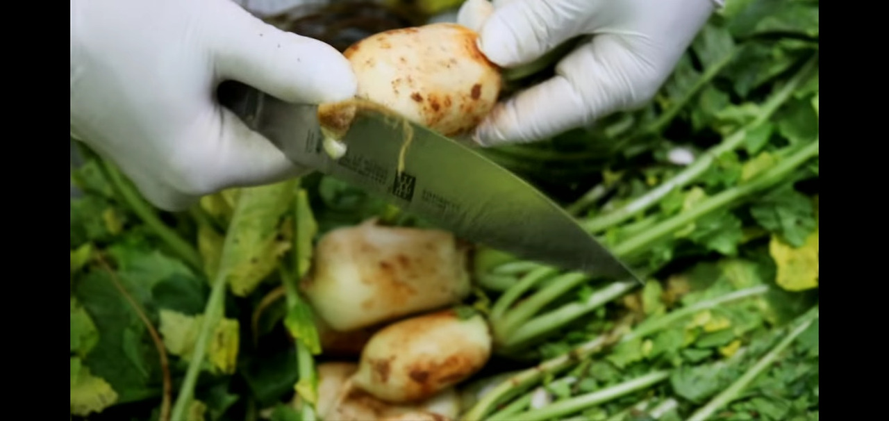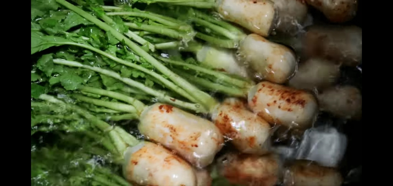 이렇게 불필요한 부분을 잘라낸 총각무는 미지근한 물에 10분 정도 담가 흙을 불려준 후, 고무장갑이나 수세미로 문질러 주면 쉽게 흙을 제거할 수 있어요. 흙을 다 털어낸 후에는 물로 두세 번 헹궈주면 더 깔끔한 총각김치를 만들 수 있답니다.