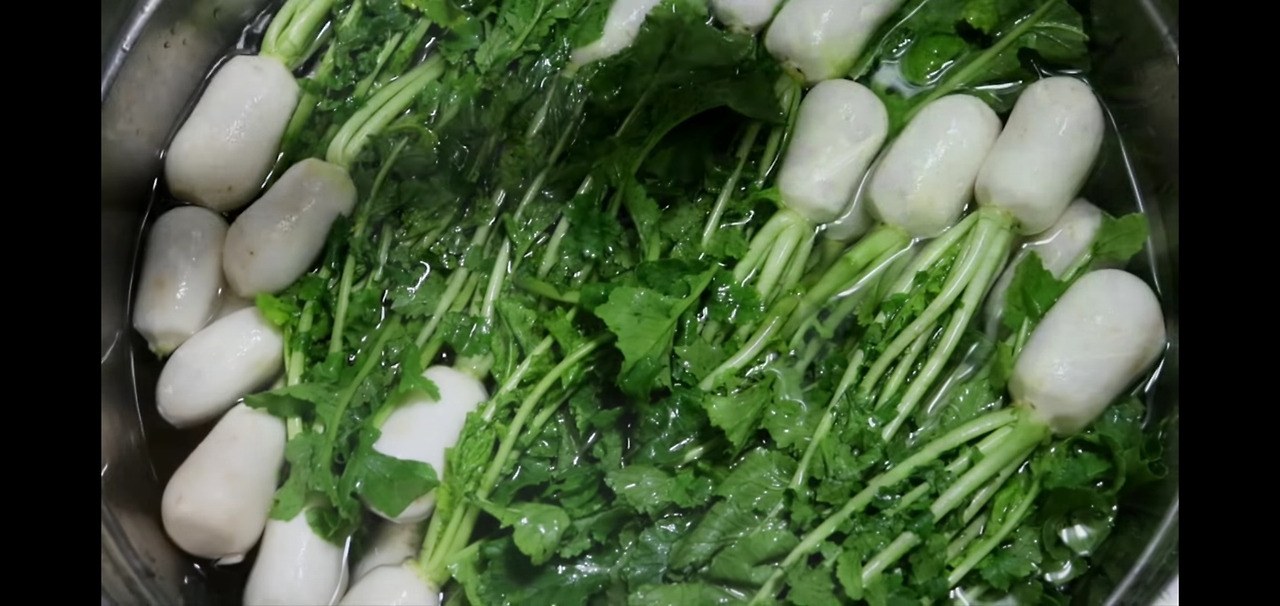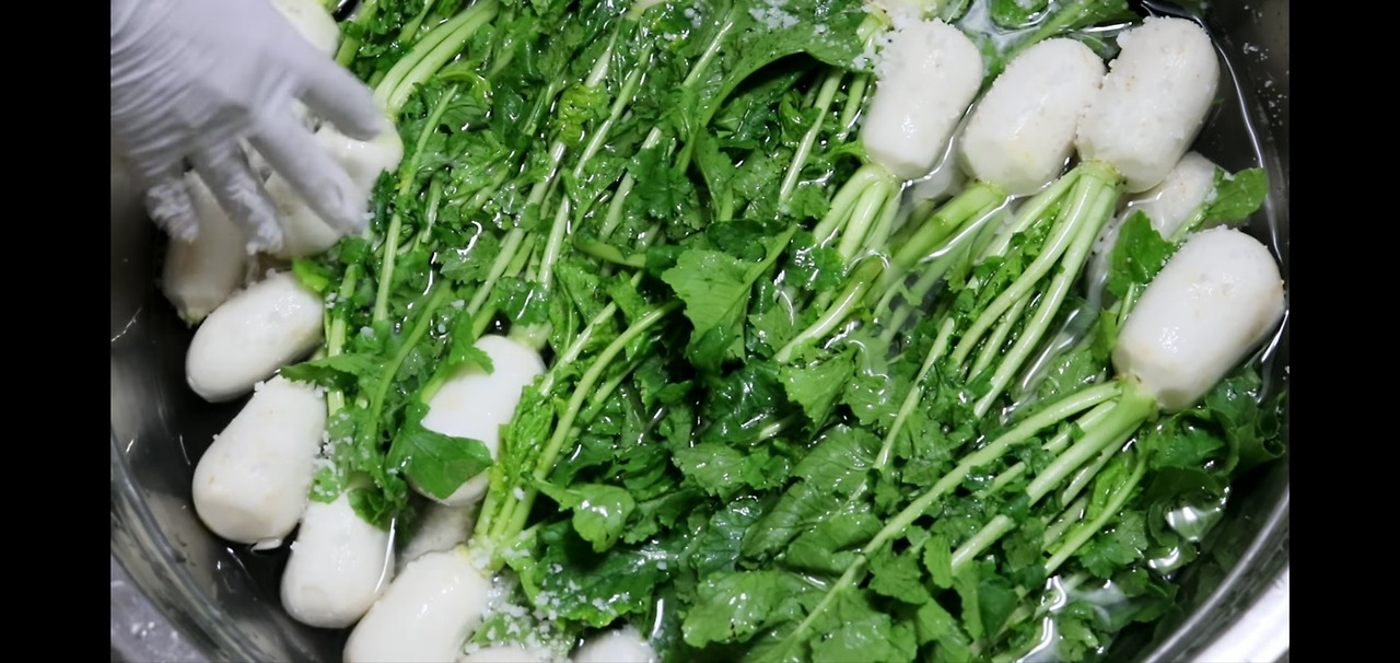 빳빳하고 간이 잘 배지 않은 총각무는 소금에 절여줘야 해요. 물 4리터에 천일염 4컵을 넣고 잘 섞은 후, 총각무를 푹 담가두면 돼요.