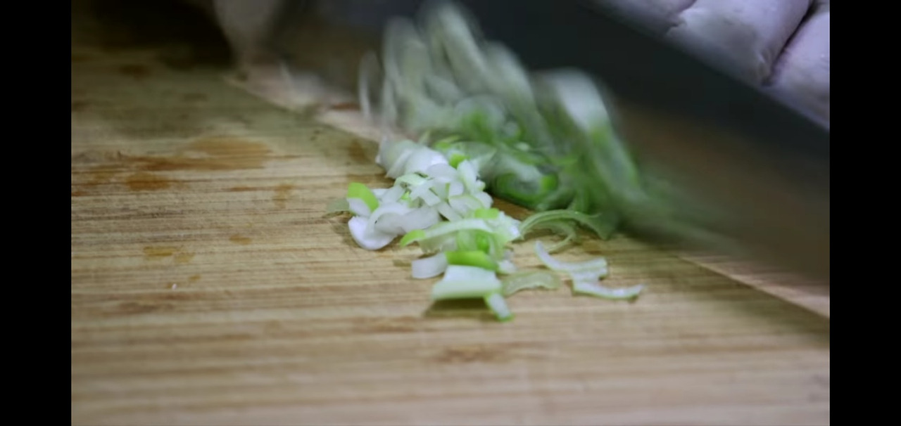 오늘 시금치나물에 필요한 채소는 딱 하나예요. 대파 반 개의 흰부분을 먹기 좋은 크기로 썰어 시금치와 함께 무칠 준비를 해주세요.