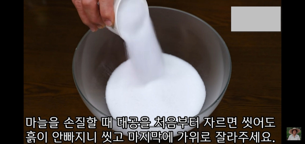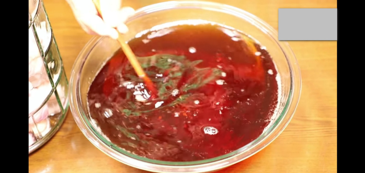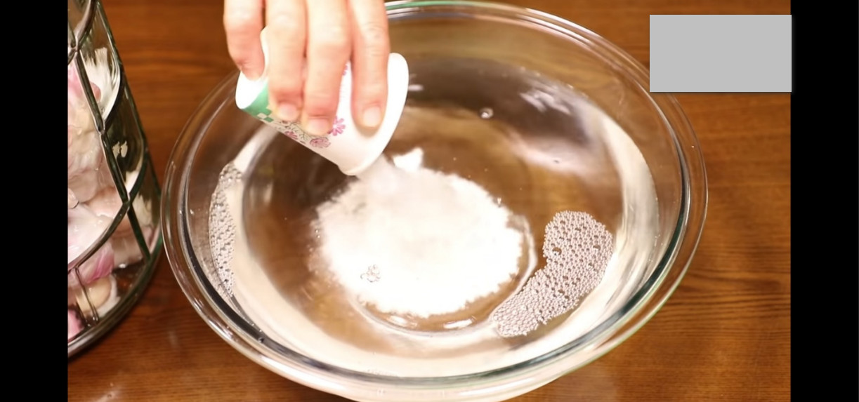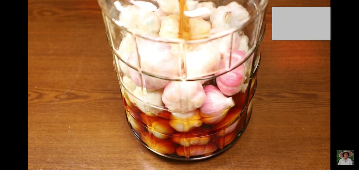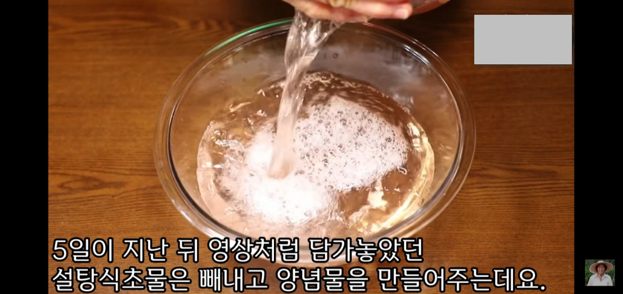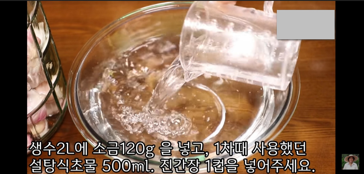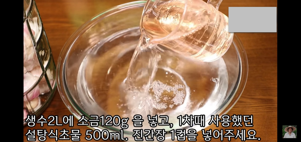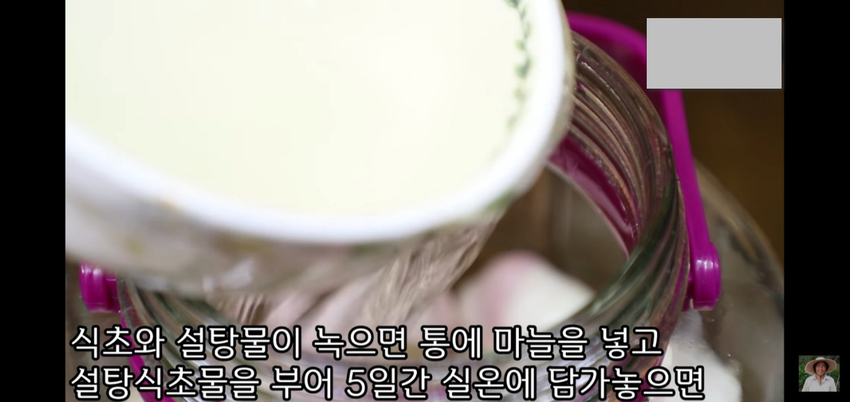 설탕과 식초를 잘 섞어서 설탕이 완전히 녹으면, 그 물을 통에 담아둔 마늘 위에 부어주면 돼요.